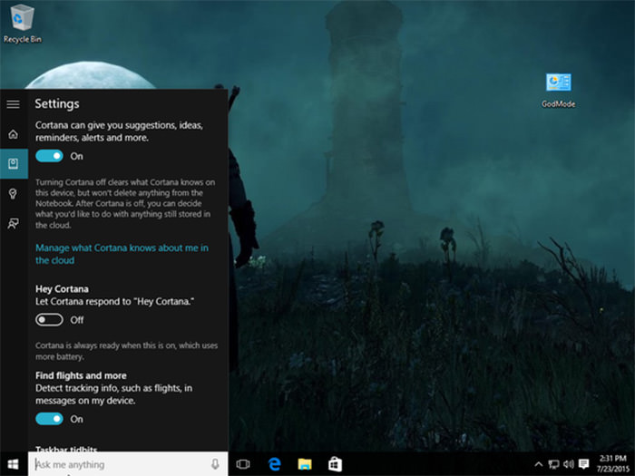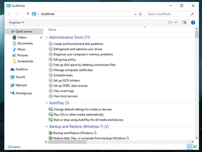 ابزار افسانهای GodMode، یکی از اجزای اصلی پنهان برای کاربرهای حرفهای ویندوز محسوب میشود که به ویندوز ۱۰ بازگشته است. همانند قبل، این ویژگی منوی کاربری قدرتمندی که تنظیمات و گزینههای پیکربندی پراکنده در بخشهای مختلف ویندوز را در یک مکان جمع میکند، آشکار میسازد. تنها کافی است که یک پوشه در دسکتاپ باز کرده و نام آن را به “GodMode.{ED7BA470-8E54-465E-825C-99712043E01C}” تغییر دهید. شما قادر به تغییر نام بخش GodMode موجود در کد فوق به هر نام دلخواهی هستید.