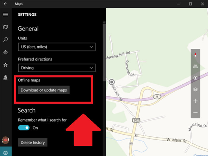 صحبت از نرمافزارها که میشود، نمیتوان از نرمافزار یونیورسال نقشهی ویندوز صرف نظر کرد. مانند هر نرمافزار نقشهی شخص ثالث، این نرمافزار هم از ویژگی نقشهی آفلاین بهرهمند شده است. برای استفاده از آن، بر روی علامت چرخدنده موجود در نرمافزار نقشه کلیک کنید و عبارت Download یا Update Maps را از زیر مجموعهی Offline Maps انتخاب کنید.