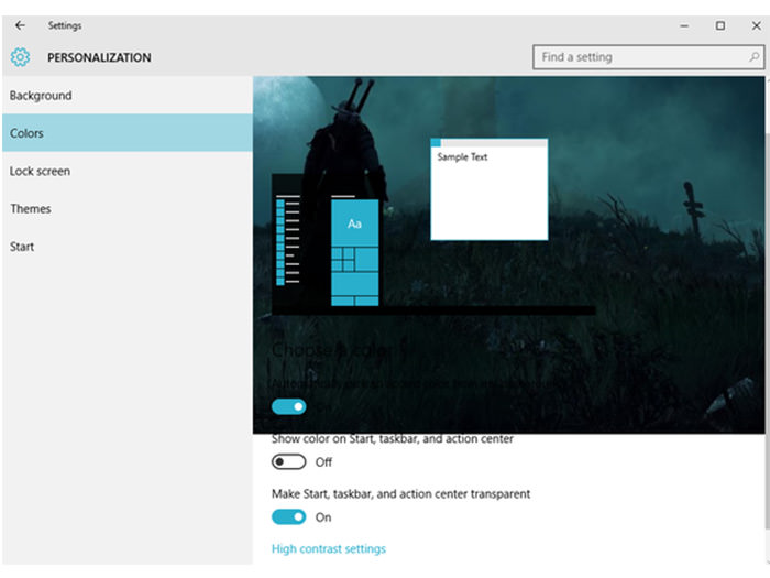 با فعال کردن گزینهی Automatically pick a color from my background از طریق کلیک بر روی دکمهی لغزندهی Off، به صورت خودکار بیشترین رنگ موجود در تصویر پسزمینهی ویندوز را به عنوان رنگ کورتانا، نرمافزارهای یونیورسال درحال اجرا و آیکنهای مربوط به آنها، انتخاب میکند. با فعال کردن گزینهی Show color on taskbar and Start menu هم میتوانید همان رنگ را در نوار وظیفه، صفحهی کورتانا و منوی جستجو اعمال کنید. با غیرفعال کردن گزینهی Make Start, taskbar and action center transparent که به طور پیشفرض فعال است، میتوانید پسزمینهی شفاف منوی شروع و نوار وظیفه را مات کنید.