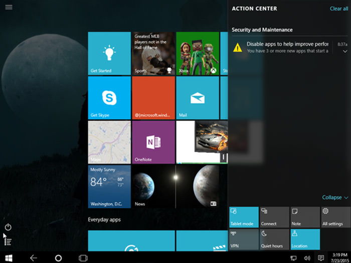 اکشنسنتر جدید ویندوز ۱۰ را با کلیک بر روی آیکن موجود در سمت راست نوار وظیفه باز کنید و دکمهی Tablet Mode را بزنید. با این کار، همه چیز از دسکتاپ حذف شده و بین آیکنهای منوی استارت، کورتانا و تسک ویو فاصله میافتد. حالا در صورت باز بودن پنجرهی نرمافزار خاصی، برای نمایش نرمافزارهای تمام صفحه و صفحهی شروع، دکمهی استارت را بفشارید. اگر خواستار نمایان کردن آیکن نرمافزارهای پین شده به نوار وظیفه هستید، در ادامهی مقاله به طریقهی نمایش آنها اشاره میکنیم.
