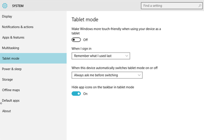 به سادگی عبارت Tablet Mode را جستجو کنید و Tablet Mode Settings را از میان گزینههای نمایان شده، انتخاب کنید. در این بخش از تنظیمات، شما قادر به فعال کردن حالت تبلت و تعیین نحوهی جابهجا شدن به این حالت از طریق بخش When this device Automatically switches tablet mod on or off هستید. شما همچنین میتوانید در صورت تمایل، با غیرفعال کردن گزینهی Hide app icons on the taskbar in tablet mod، از مخفی شدن آیکنهای نوار وظیفه هنگام جابهجا شدن به حالت تبلت جلوگیری کنید. به علاوه، میتوانید نحوهی راهاندازی سیستم با حالت تبلت و دسکتاپ را هم از طریق When I sign in موجود بخش یاد شده، تنظیم کنید.