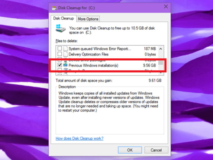 عبارت “Free up disk space by deleting unnecessary files” را جستجو کنید و بر روی آن کلیک کنید. سپس درایو مورد نظر را انتخاب کرده و Ok کنید. پس از اتمام اسکن، بر روی دکمهی Clean up system files موجود در پنجرهی باز شده کلیک کرده و بازهم بر روی Ok کلیک کنید. در پنجرهی موجود تیک عبارت Previous Windows installations را زده و دوباره Ok را بفشارید.