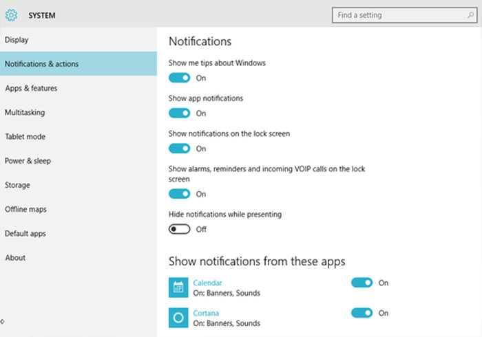 احتمالا شما هم قصد غیرفعال کردن اعلانیههای آزار دهندهی برخی از نرمافزارهای یونیورسال و حتی جدیدا نرمافزارهای دسکتاپی مانند تلگرام را دارید. یا اینکه ممکن است نخواهید هنگام ارائهی مقالهای به وسیلهی پاورپوینت، هیچ اعلانیهای نمایان شود. برای سفارشیسازی تنظیمات مربوط به اعلانیهها، در منوی شروع مسیر Settings→ Systems→ Notifications and actions را دنبال کنید.