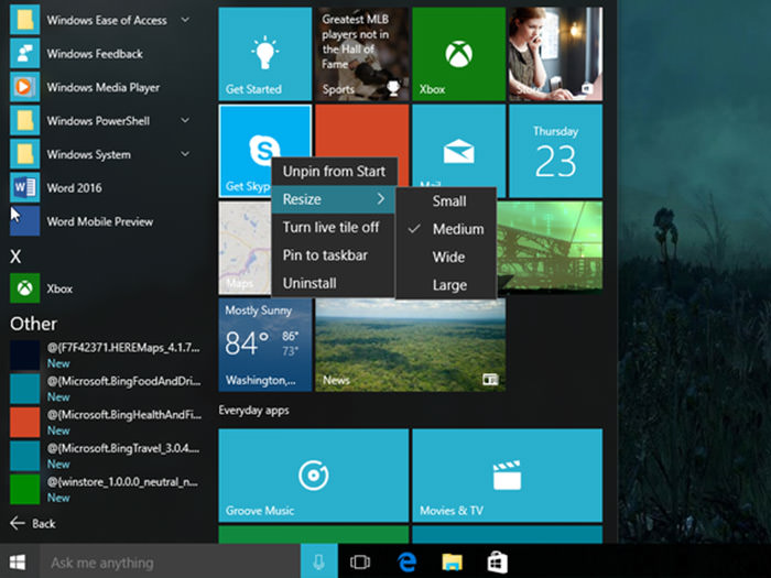 کاربران ویندوز ۱۰ قادر به ایجاد منوی شروع نسبتا شخصی هستند؛ به طوری که میتوانید دقیقا مانند صفحهی شروع ویندوز ۸، با انجام کلیک راست بر روی هر کاشی، ابعاد آن را به چهار حالت کوچک، متوسط، بزرگ و عریض تغییر دهید. این درصورتی است که علاقهمند به استفاده از منوی شروع سنتی و مدرن در کنار یکدیگر باشید!