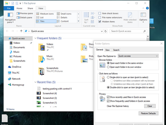 هنگامی که مرورگر فایل ویندوز ۱۰ را باز میکنید، به صورت پیشفرض صفحهی Quick Access که شامل پوشهها و فایلهایی است که اخیرا به آنها مراجعه کردهاید، نمایان میشود. صفحهی یاد شده، به خاطر دسترسی سریعی که در اختیار کاربران میگذارد، میتواند سودمند باشد؛ اما در صورتی که تمایل به مشاهدهی This PC و درایوهای دیسک سخت در مرورگر فایل را دارید، پس از باز کردن مرورگر فایل به مسیرView→ Options در نوار ریبون مراجعه کرده و از منوی کشویی Open File Explorer to، گزینهیThis PC را برگزینید.