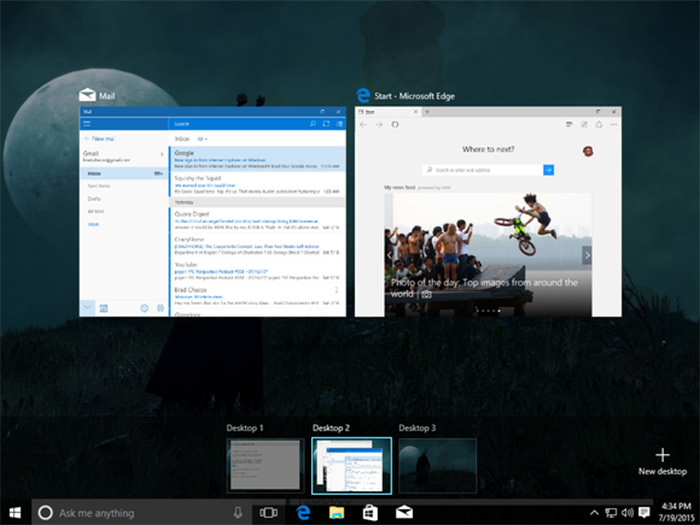 دسکتاپ مجازی امکان تفکیک نرمافزارهای درحال اجرا را درون محیطهای جداگانه میسر میکند. جابهجایی بین دسکتاپهای مجازی ایجاد شده، با استفاده از Task View (دکمهای که به نظر دارای دو پنل تو در تو، واقع در نوار وظیفه است) یا کلیدهای ترکیبی Windows + Tab بسیار آسان است. همچنین میتوان با استفاده از کلید میانبر Alt + Tab بین تمامی پنجرههای موجود در همهی دسکتاپهای مجازی جابهجا شد.