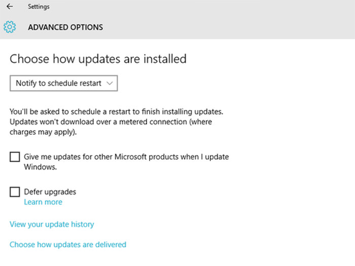 به منظور پیکربندی تنظیمات مربوطه، بر روی عبارت Settings در منوی شروع کلیک کرده و به مسیر Updates and Recovery→ Windows Update بروید. اگر بروز رسانی ویندوزی وجود دارد که نیازمند راهاندازی دوباره است، باید در سمت چپ صفحه گزینهی Select a restart time را برای اعمال زمان مناسب برای انجام بوت دوبارهی سیستم، تعیین کنید. حتی میتوانید با مراجعه به بخش Advanced options و انتخاب گزینهی Notify to schedule restart از منوی کشویی Choose how updates are installed، هنگام اتمام نصب بروز رسانی، از طرف ویندوز اعلانیهی راهاندازی دوبارهی سیستم را دریافت کنید. با این وجود، بهبودهای فرآیند بروز رسانی ویندوز ۱۰ به اینجا ختم نمیشود!
