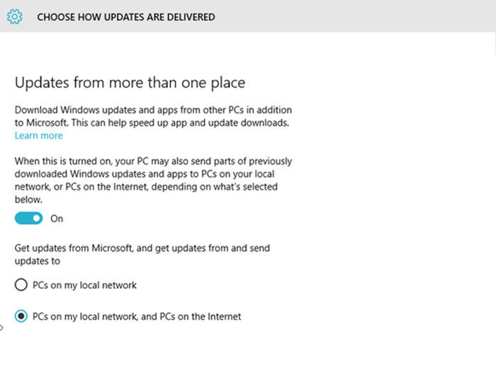 برای اعمال تنظیمات مربوطه، به مسیر Settings→ Update & Recovery→ Windows Update→ Advanced Options مراجعه کرده و روش دانلود بروز رسانی مورد نظر خود را با کلیک بر روی لینک Choose how updates are delivered و فعال کردن آن، انتخاب کنید. شما دو انتخاب در پیش رو دارید: PCs on my local network (دریافت بروز رسانی از مایکروسافت و به اشتراک گذاری و دریافت بروز رسانیها از شبکهی محلی ایجاد شده به وسیلهی کاربر) و PCs on my local network, and PCs on the internet (دریافت و به اشتراک گذاری بروز رسانیها از مایکروسافت، شبکهی محلی و کل اینترنت)، که گزینهی دوم به طور پیشفرض فعال است.