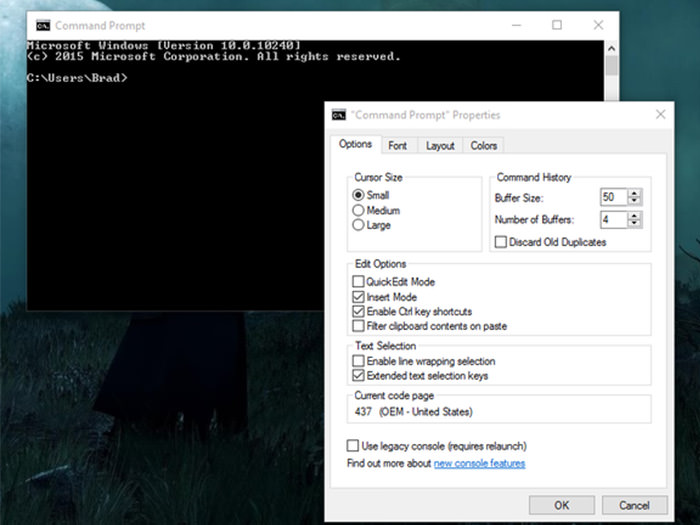ویندوز ۱۰ همراه با ویژگیهای جالبی از جمله خط فرمان پیشرفته معرفی شد. هماکنون کاربران میتوانند با استفاده از کلیدهای ترکیبی Crtl + C و Crtl + V درون خط فرمان به ترتیب اعمال کپی و پِیست را انجام دهند. برای فعال کردن این موارد، خط فرمان را باز کنید و در نوار عنوان کلیک راست کنید، سپس Properties را برگزینید. شما میتوانید ویژگیهای جدید را از بخش Edit Options مربوط به بخشی از زبانهی Options بیابید و فعال کنید.