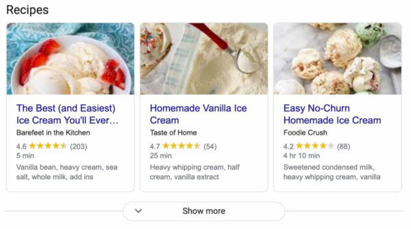 اما ریچ اسنیپت، نسبت به نرمال اسنیپت اطلاعات اضافیتری را در کنار URL و توضیحات صفحه به نمایش میگذارد. ممکن است تصویری از درون صفحه به همراه رتبهبندی و اطلاعات دیگری را در کنار نتایج جستجوی خود مشاهده کنید. بسته به سایت و محتوایی که ارائه میدهد، انواع مختلفی از ریچ اسنیپت نمایش داده میشود. که از جمله انواع آن میتوان به: رتبهبندی ستارهدار، ویدئو و عکسهای درون صفحه، اطلاعات محصول، آدرس و شماره تلفن شرکت، زمان مورد نیاز برای مطالعه، یا زمان مورد نیاز برای پخت یک غذا، تاریخ و زمان و مکان آن رویداد، و … اشاره نمود.